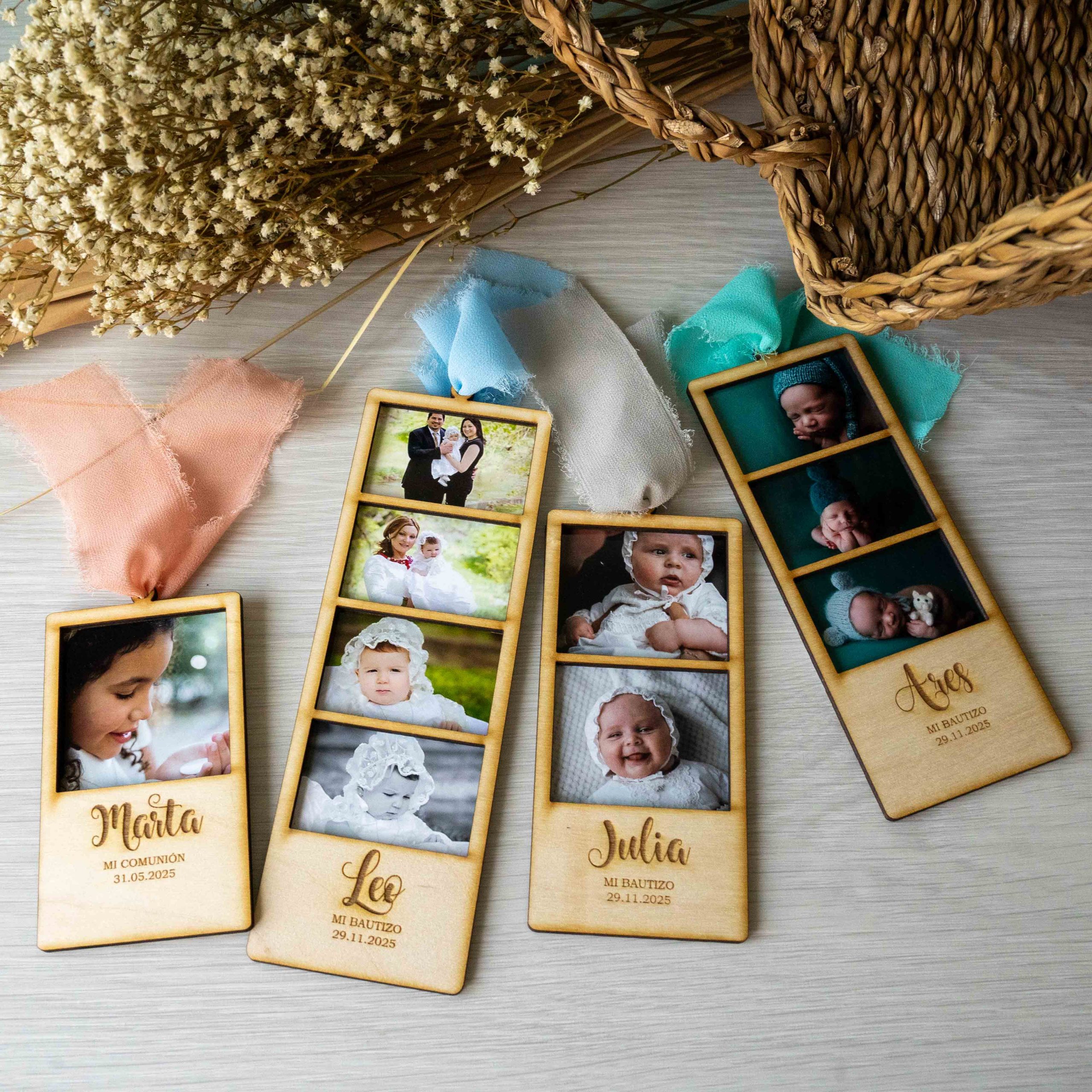 👶 Bautizos: Un detalle precioso con la foto del bebé, su nombre y la fecha de su bautismo.
